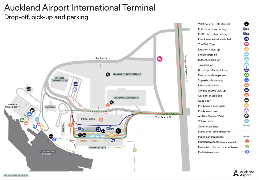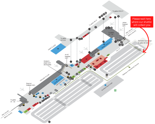 Please make your way to door 4. Off-site shuttles are located at the Off-site Transfer zone - lanes 1 & 2, north of the Transport Hub outside the arrivals area of the international terminal. The Off-site Transfer zone is located behind the Te Arikinui Pullman hotel and is about a 5–7-minute walk.